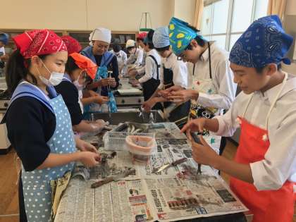 2年の家庭科では、イワシの手開きの実技試験が行われました。包丁を使わずに指だけでイワシを開き、内臓や骨をとって身だけにします。ただ、今年のイワシはどれも大きくて、骨が固く、部分的に包丁を使わなくてはいけないので、みんな悪戦苦闘していました。