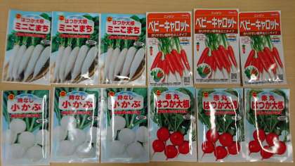 冬野菜(赤株・白株・大根・人参)の種をまきました。
