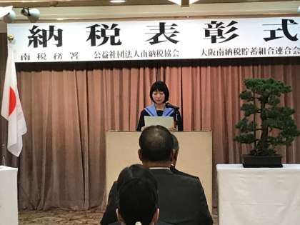 昨日、南税務署等が主催する「納税表彰式」が行われ、その最後に「中学生の税についての作文」の表彰式が行われました。本校から3年生ばかり9名が受賞しましたが、その中で最高の賞である「なんば市税事務所長賞」に輝いた山本倭子さんが代表として招かれ、参加者の前で受賞作文「私たちにできる、税の一歩とはなんだろう」を読み上げてくれました。緊張していたと思いますが、堂々と読み上げ、終了後、参加者から多数、お褒めの言葉をいただきました。