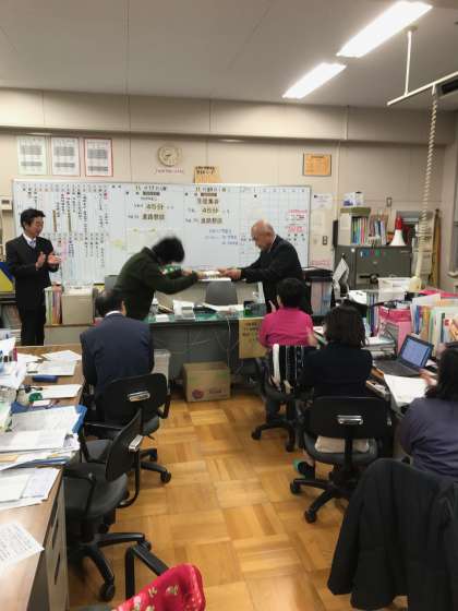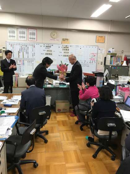 今朝の職員朝礼で職員表彰が行われました。今年度、本校からは勤続25年の平岡先生と勤続35年の笹田校長先生が表彰を受けました。表彰状とともに、西口PTA会長様から花束とお祝いの授与も行われました。会長様、早朝よりありがとうございました。そして、お二人の先生方、本当におめでとうございます。