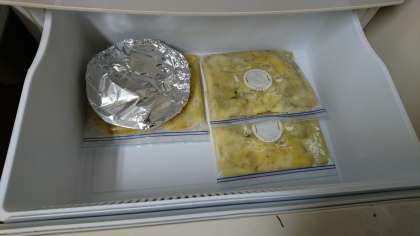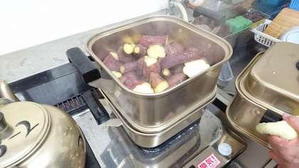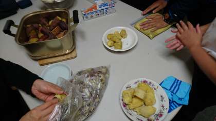 園芸部の畑で採れたサツマイモも十分に乾燥した頃合なので、蒸し器で蒸かした後、皮を剥いて押しつぶし、冷凍保存しました。
