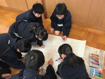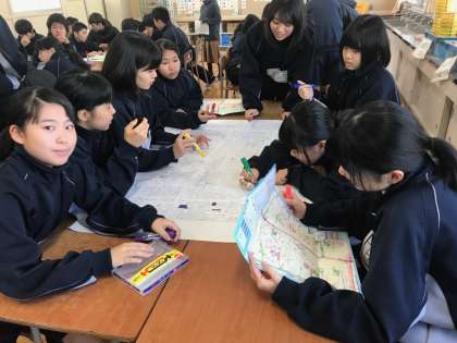 2年生は、地域ごとに分かれて図上訓練DIGを行いました。拡大した地図に様々な情報を書き加えていきます。みんなワイワイ言いながらも、真面目に取り組んでいました。