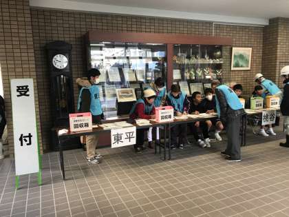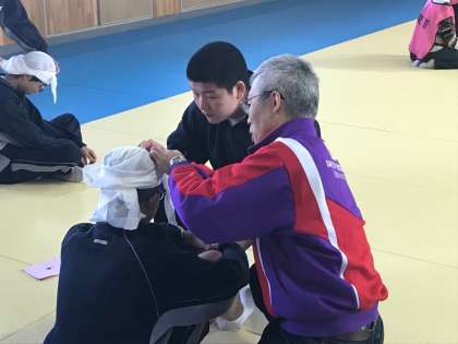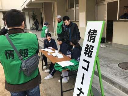 写真は情報班、救護班、管理班の様子です。みんなテキパキとした動きで地域の方も感心しておられました。特に救護班は命に関わる場合もあるので、頭部の傷の応急処置を真剣に取り組んでいました。