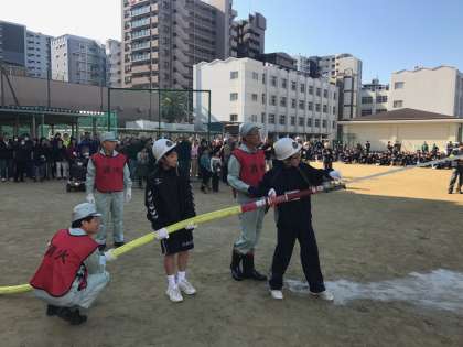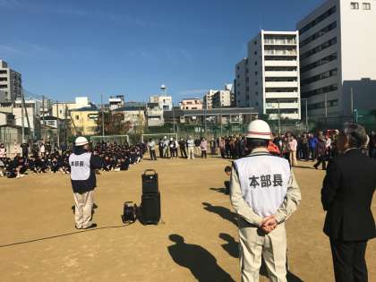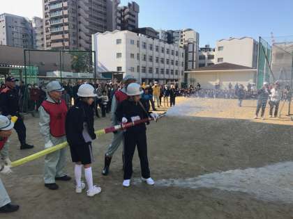 最後は地域の方々も含めて全員が運動場に集合し、可搬式ポンプの操作訓練をしました。生徒会から2組が放水のデモンストレーションを行ってくれました。閉会式では、川口会長様の挨拶のあと、消防署長、区長からも講評とお言葉をいただき、今日の訓練の意義を確認して終えていきました。