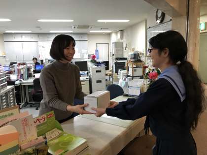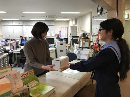 先日、生徒会が行った赤い羽根募金を、中央区社会福祉協議会にお渡しに行きました。少額でしたが、多くの人にご協力いただきました。