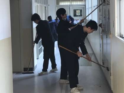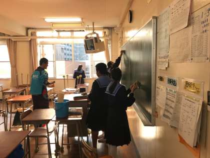 高い所や細かい所も入念に掃除していました。空調機のフィルターも管理作業員さんに外してもらい、手分けして洗っていました。黒板消しクリーナーも分解して丁寧に磨いていました。