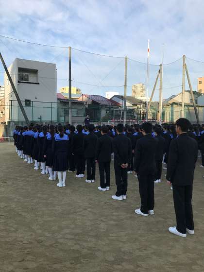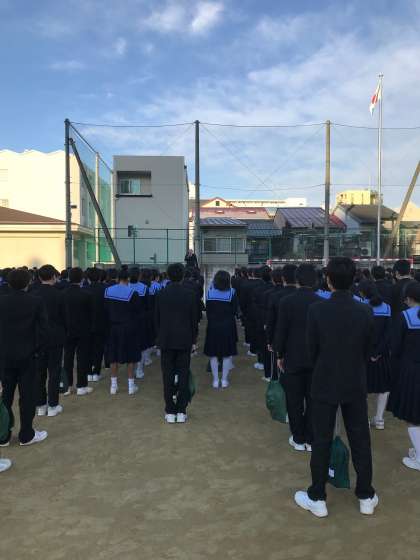 今日も寒い朝でしたが、運動場で生徒集会を行いました。校長先生からは、明後日の17日、阪神・淡路大震災から23年が経ち、今年の神戸で配られたポスターには「忘れていませんか。伝えていますか。」の文字が最初に書かれている、文字だけのシンプルなものになっており、そのことが「風化させてはいけない」という強いメッセージになっているというお話がありました。自分が経験していないことは、人間は時が経つにつれ記憶が薄れがちになります。ましてやまだ産まれていなかった中学生にとって、あの大震災をどう受け止め、何を学ぶかを考えることは大切なことです。杉本先生からもお話がありましたが、今週の金曜日に防災フォーラムを行います。今も被災地支援を続けておられるプロの写真家の方からお話を聴きます。知らないことを知ることの大切さ、被災された方の思い、被災者とつながり続けている方の気持ち等をしっかり受け止め、考え、自分の生き方につなげていってほしいと思います。