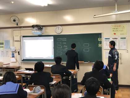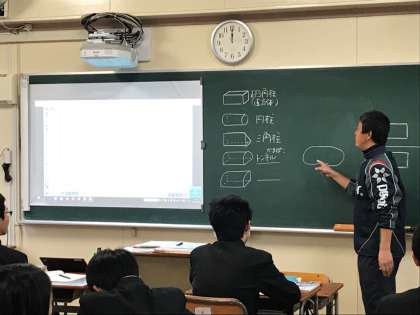 1年の数学は、空間図形を学習しています。今日の授業では、立面図と平面図が合同な長方形になる立体は、どんな立体が考えられるかをクラスとして考え、出し合っていました。ユニークな発想や「惜しい、もうひと考えがいるよ」というような意見が積極的に出され、全員が活発に頭を使っていました。この設問の答えは、結果的に1組が一番たくさん見つけられたということでした。こうやってしっかり想像力を活性化させることは、特に空間図形では大切だなと感じました。