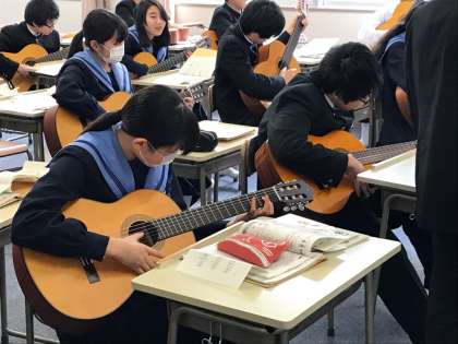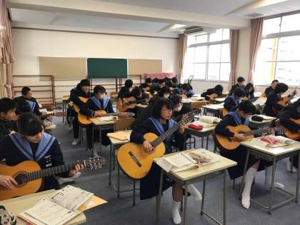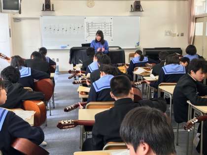 2年の音楽は、ギター演奏に取り組んでいます。まだ音階を確認し、簡単な曲(アマリリス)を弾く段階ですが、中には暗譜して滑らかに弾ける人もいました。こらからどこまで上手になるか楽しみですね。