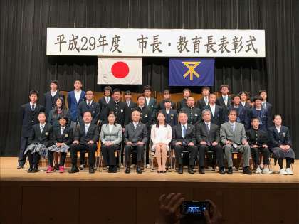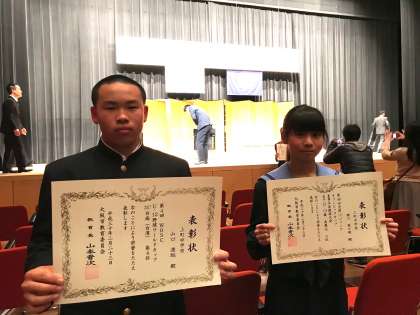 二人とも舞台上ではかなり緊張していましたが、式後は笑顔も見られ、嬉しそうでした。付き添いで来られたお母様方も大変喜んでおられました。上中生が全国や世界で活躍するというのは、われわれ上町中関係者にとっても本当に嬉しい限りです。お二人には今後益々の活躍を期待するとともに、この二人に続く上中生が出てくることも大いに期待したいと思います。黒川さん、山口さん、本当におめでとうございます!