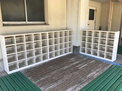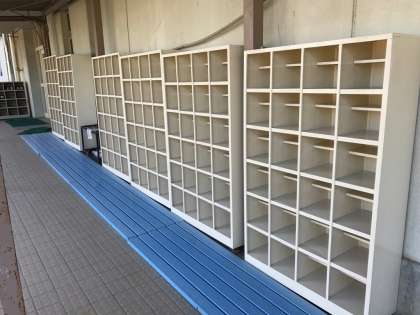 以前ホームページに製作中の記事を載せた、管理作業員さんによる体育館前の下足箱が完成しました。前の錆びた状態とは雲泥の差で、新品を買ってきたような美しい仕上がりになっています。これで3年生の卒業式も、参加者全員が気持ちよく迎えることができますね。毎度毎度、生徒たちのためにいろんな所をきれいにしたり、便利なものを作っていただき、ありがとうございます。