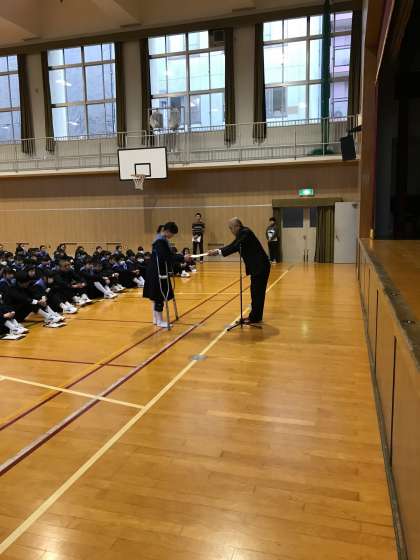 校長先生のお話の後、表彰状の授与が行われました。先日、教育長表彰を受けた1年生2名、バレー部、そして元気アップ学習会に40回以上参加した3名が表彰されました。それぞれ分野は違いますが、頑張る上中生の姿はやっぱりかっこいいですね。他の人も自分のできるところで頑張る姿をいっぱい見せてほしいですね!