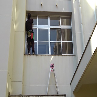業者作業による校舎の高所窓清掃を学校予算で行いました