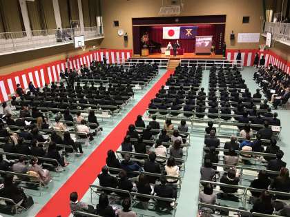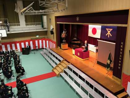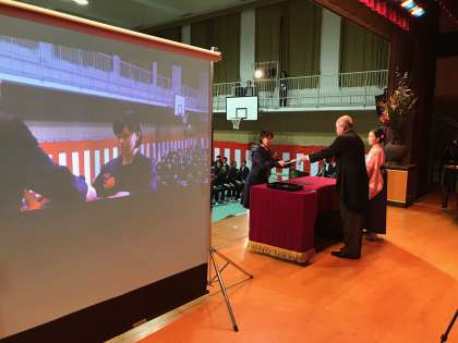授与されている生徒一人ひとりの表情は、プロジェクターで舞台上のスクリーンに大きく映し出されています。みんな、きれいな礼と習った通りの作法できっちり受け取っていました。授与の後は校長先生からの式辞がありました。卒業生に対する思いをお話になりました。