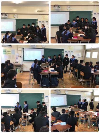 先週2,3組で数学のプレゼンテーションを行いましたが、今日は最後の1組です。課題は「体育大会の大縄跳びは2列がいいか、3列がいいか」です。