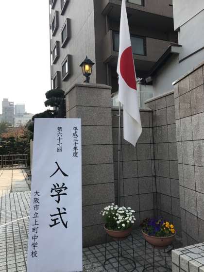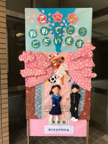 本日は、上町中学校の第67回入学式です。お天気にも恵まれ、準備万端整いました。恒例の美術部によるお祝いのパネルも玄関前に飾られ、歓迎ムードを盛り上げてくれています。さあ、新1年生のみなさん、笑顔が溢れる入学式にしましょう!