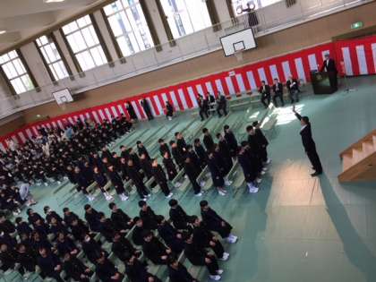 一昨日、今年度の入学式を晴天の下で行いました。緊張感の中、入場を終え、校長先生からの式辞、西口PTA会長様からのご祝辞を新入生は真剣に聴いていました。
