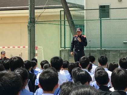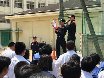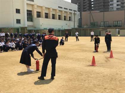 全員の確認までに3分16秒でしたが、消防署の方のお話では、消防車が現地に着くまでに4〜5分は最低かかるので、まずまずのタイムということでした。生徒会による消火訓練の後、忘れものに気づいても部屋には絶対に戻らない等、火災時に大切な心構えもお話しくださいました。