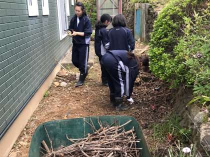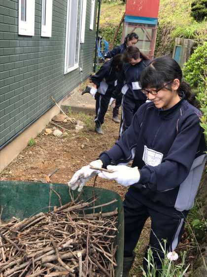 ここでは、焚き付け用の小枝集めと雑草抜きをやっていました。幼い子どもさんもいました。