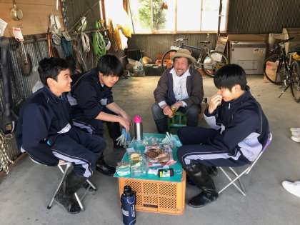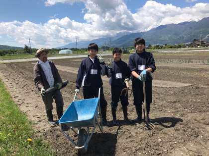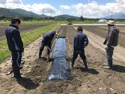 ここでは、ジャガイモを植えた後、休憩し、その後ジャガイモの畝をビニールで覆う作業をしました。