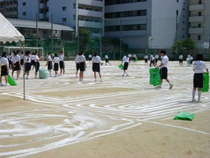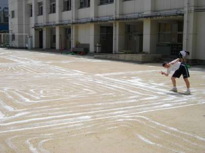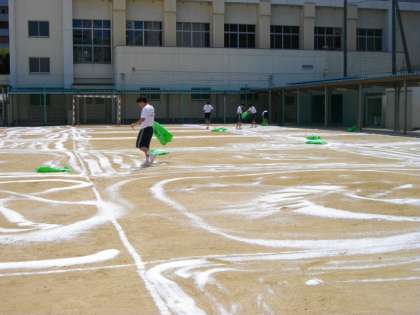 本日運動場ににがりを散布しました。生徒、教員、管理作業員が協力して取り組めました。土に馴染めば砂ぼこりが立ちにくくなるので、これからの体育等の授業が取り組みやすくなるでしょう。明日以降が楽しみです。