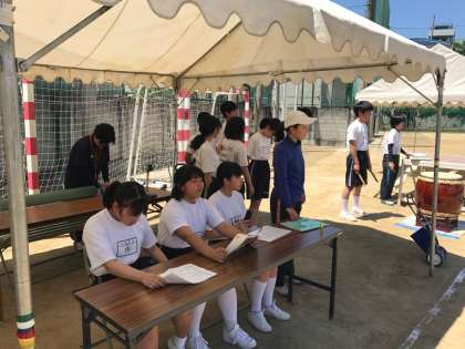 今年一番の暑さの中、1回目の全体練習を行いました。2、3年生は昨年を思い出しながら、また1年生は初めてなのでしっかり指示を聞いて取り組んでいました。