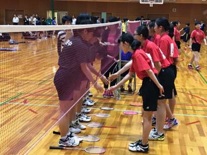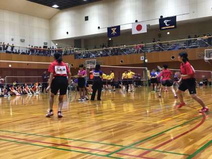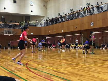 6月2日(土)、東成スポーツセンターにおいて春季総体の開会式とバドミントンの試合が行われました。わが上中も女子が5月の予選を勝ち上がり、この本大会に臨みました。3チームのリーグ戦で、1位のみが準々決勝に上がれるというシステムです。まず上中は城東中学校と対戦し、最初のダブルス、シングルスを連取し、勝利を収めました。