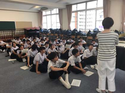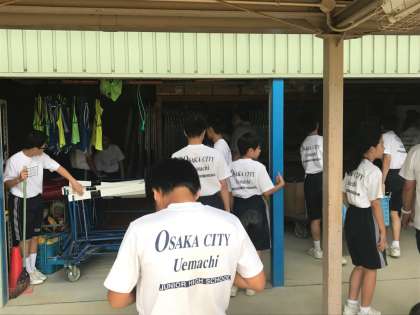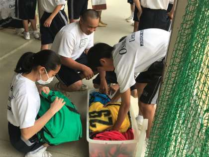 用具準備係のメンバーは、体育倉庫から競技に使うものを出して、点検、整備、整理をしました。召集係のメンバーは、担当の先生から召集の手順を聞いていました。
