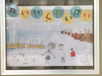 予報通り、本日は雨のために予定されていた体育大会予行が明日に延期になりました。明日のグランド状態も微妙ですが、天気予報通りにいけば金曜日の本番は大丈夫だと思います。青空学級のみんなも、体育大会への願いを込めて教室前にポスターを飾ってくれていました。みんなの願いが届きますように・・・。