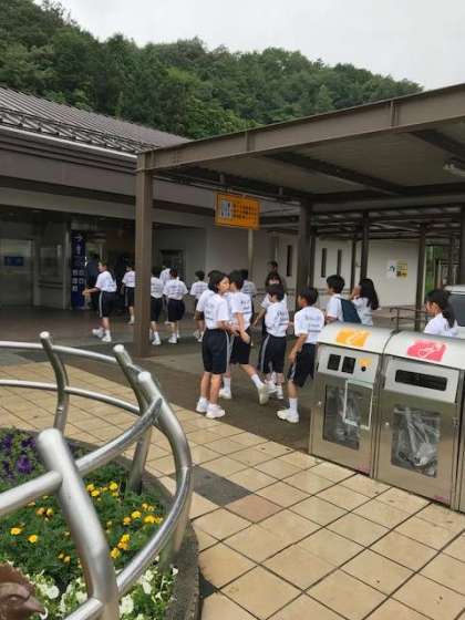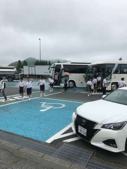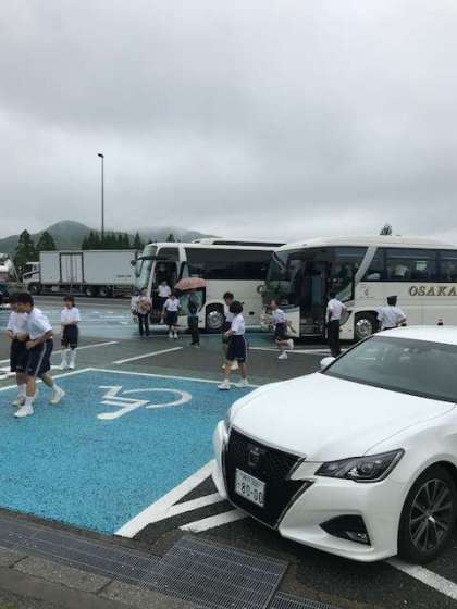 高速道路が渋滞していたので別ルートで西紀SAに着きました。トイレ休憩です。予定より10分ほど遅れましたが、みんな元気です。