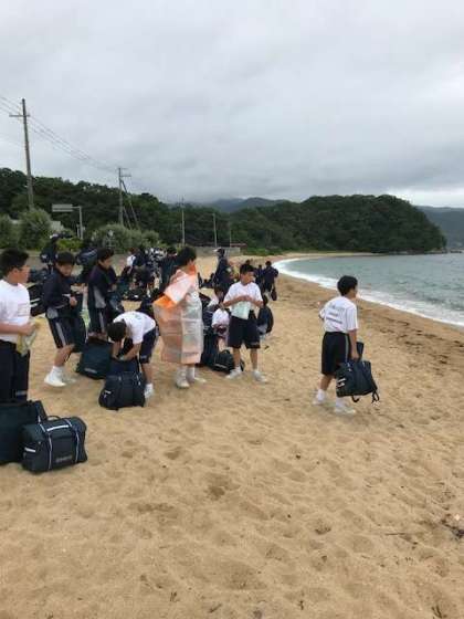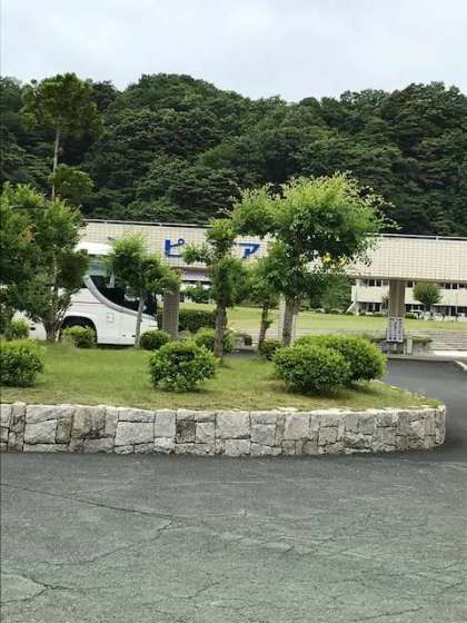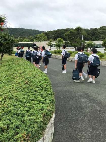 予定通りマリンピアに到着しました。時間通りです。浜辺でクラス写真を撮った後、昼食を食べています。