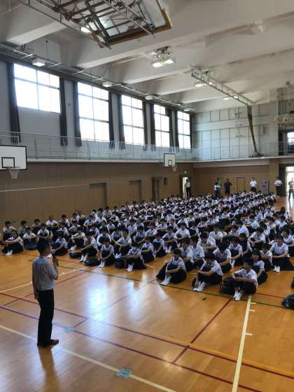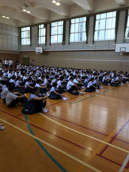 今日は期末テストの2日目で、部活動もないのを利用して、災害時の集団下校訓練を行いました。18日に起こった地震の影響もあり、説明や諸注意を、みんな真剣に聞いていました。地区別に体育館に集合し、先生方の引率で各地区の一時避難所へ集団で移動しました。上町中校区は、桃谷地区、桃園地区、東平地区、金甌地区と4つ地区に分かれています。それぞれ空堀桃谷公園、桃園公園、東平北公園、高津公園が一時避難所です。それぞれを目指して災害時のことを想定しながら、スムーズに移動できていました。もしもの時に、この訓練が生かせるようにしましょう。