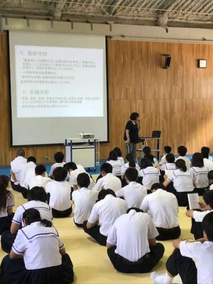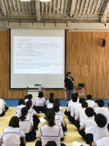 進路指導主事の幾島先生が、スクリーンを使って進路の手引きに掲載している内容を、分かり易く説明してくださいました。扇風機だけの暑い室内でしたが、具体的な高校名がでてくると特に真剣に話を聞いていました。30日には土曜授業のあと、保護者向けの説明会を予定しております。ぜひ聞きに来てください。よろしくお願いします。