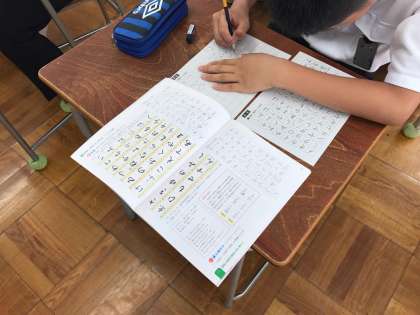 1年の国語は今、分割授業を行なっています。クラスを半分ずつぐらいに分けて、文法と書写(今は硬筆)をそれぞれ習っています。少人数なので質問もしやすく、指導者側からも目が届きやすく、密度の濃い授業が展開できます。