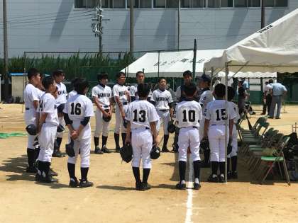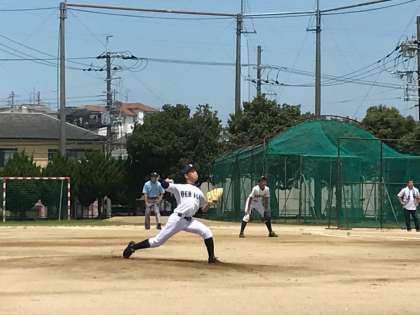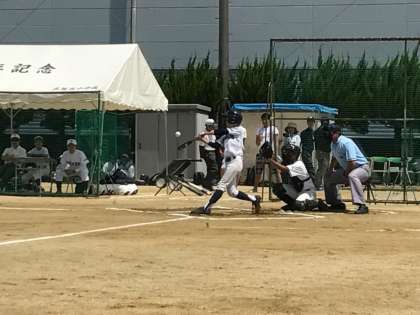 7月14日(土)に野球部が大阪府大会に臨みました。対戦相手は大阪府内でも実績を残している強豪の津田中学校です。わが上中の先発投手は安定感のある岡田さんです。ストレートのコントロールとキレのある変化球で勝負していました。