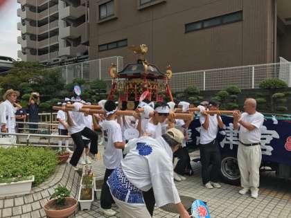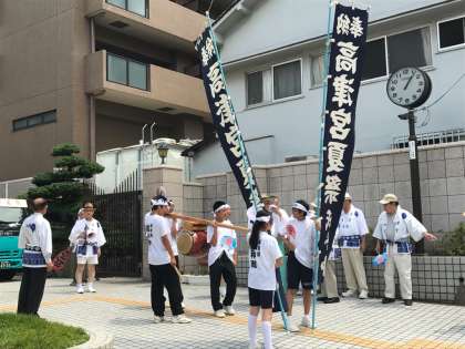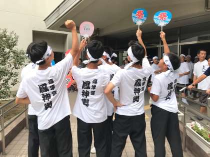 今日から高津神社の祭礼が始まりました。初日の今日は、恒例の子ども鳳神輿の練り歩きです。本校の正門前に神輿が到着し、いよいよスタートです。今年も参加してくれる生徒の皆さんは、張り切っていますよ!