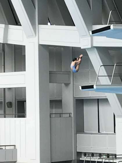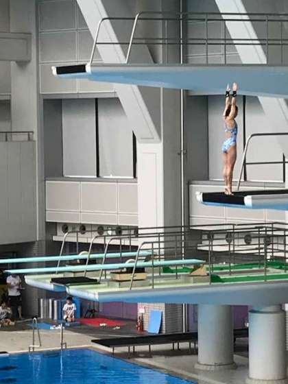 先日の7月22日(日)、大阪プールにおいて、大阪中学校水泳競技大会の飛込みの部が開催されました。2府3県の中学生の飛込みの選手が集まって、行なわれました。この大会は、全国大会の、大阪府予選にもなっており、上町中学校からは昨年に続いて、2年生の黒川菜々実さんが出場し、飛び板飛込と、高飛込の両方の種目で大阪府1位に輝き、全国大会出場を決めました。昨年に続いての出場で、活躍が期待されます。8月5日の近畿大会を経て(大阪開催)8月17日から始まる岡山県倉敷市での全国大会に挑みます。全国での上位入賞をめざして、これからも頑張ってください。みんなで応援しましょう。