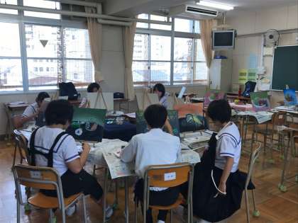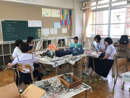 夏休みの美術部の活動は、2学期の文化活動発表会や大阪市総合文化祭へ出品する作品づくりに取り組んでいます。静物を油絵で描いたり、屋台の模型を作ったりとバラエティに富んでいます。