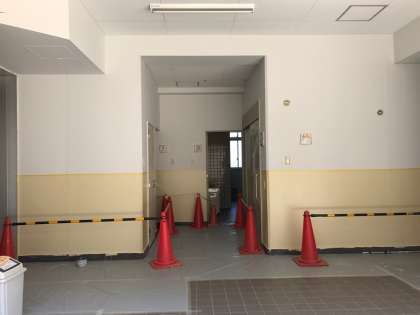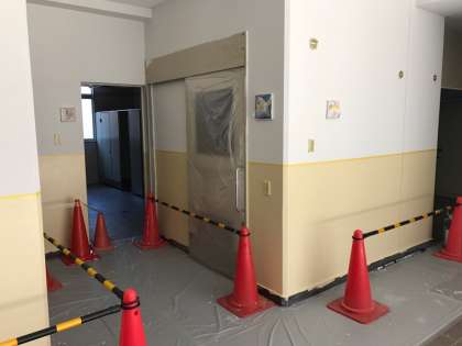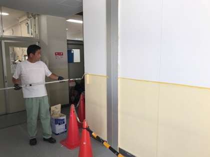 今年もまた夏休みを利用して、管理作業員さんが廊下などの壁を綺麗にしてくれています。今は北校舎1階のトイレ周りの壁を、白色とクリーム色の2色のペンキできれいに塗ってくれています。この酷暑の中、頭の下がる思いです。上中生も感謝の気持ちを持って、これからも大切に使っていこう!
