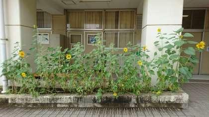 青空学級前の花壇に、5月に種をまいたヒマワリが咲き始めました。