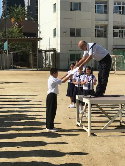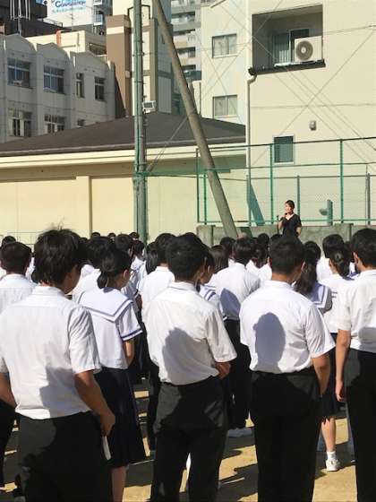 その後、今日から本校に来られた新しい英語の先生、岡本先生の紹介とご挨拶がありました。また、水泳のブロック大会で第2位になった1年生高島さんの表彰もありました。