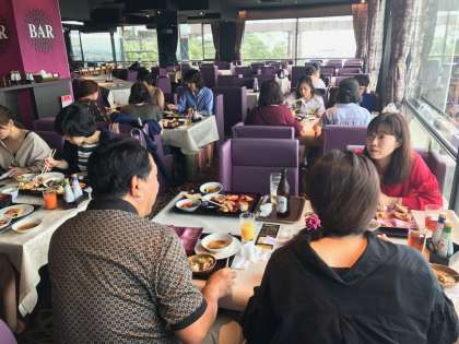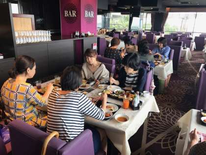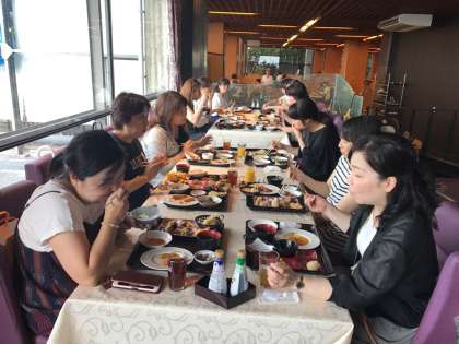 いよいよ昼食の時間です。台風の影響で皆さんが楽しみにしていた「箕面川床料理」が中止になり、急遽、幹事さんがとってくださった大江戸温泉物語箕面店でのバイキング料理をみんなでいただきました。豊富な種類と一つひとつの料理のおいしさに、皆さん大満足な顔で、何回も料理を取りに行っておられました。「デザートは別腹よ!」と元気にスイーツを食べている姿は、すごく頼もしかったですよ。