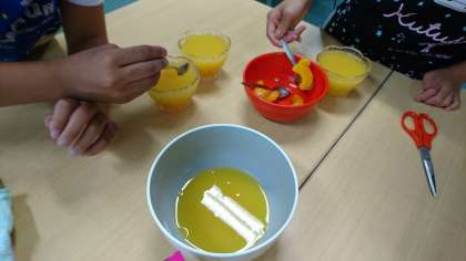 まず、固まるまで時間のかかるオレンジゼリーを作って、冷蔵庫に冷やしておきました。(写真上)