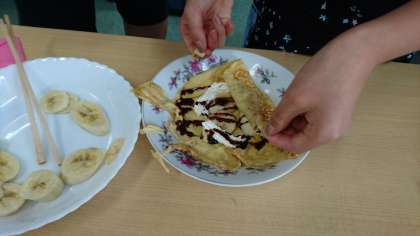 次に、ホットプレートでチョコバナナクレープを作って、早速食べました。
