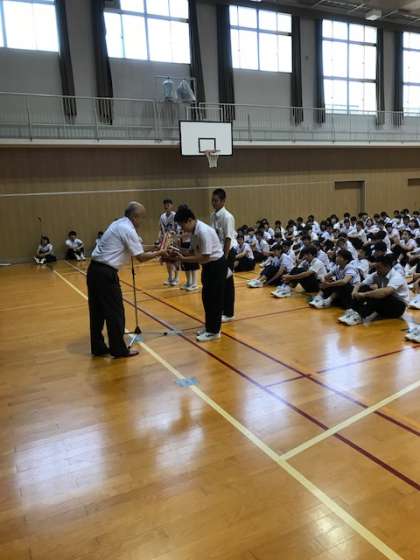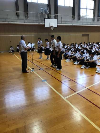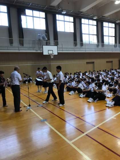 その後、夏のジュニアオリンピック水泳大会高飛込みの部で、全国第2位になった2年生の黒川さん、また9月2日に行われ、見事中央区中学生大会でダブル優勝したソフトボールチーム、キックベースボールチームの表彰が行われました。上中生が様々なところで活躍していることが非常に嬉しいですし、誇りに思います。皆さん、よく頑張りました!