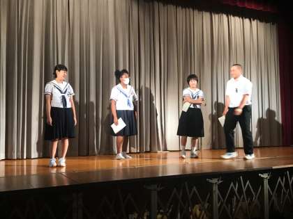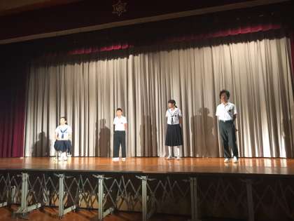 本日より、文活に向けての舞台練習がスタートしました。2年生は、平和をテーマにした舞台発表です。今日は劇の部分を中心に練習しました。初めてということで、まだ背景や衣装はありませんが、自分たちで提案し、いろいろ修正しながら進めていってました。