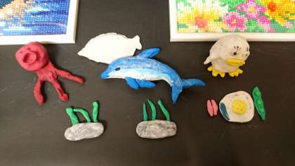 写真中は、粘土で作った動物(クラゲが逆立ち)と、「ごはんのおかず」です。