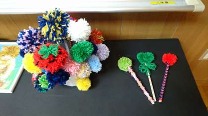 写真下は、毛糸のポンポンと割り箸で作ったチュッパチャプスです。
