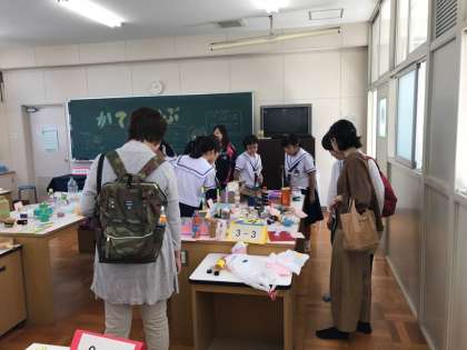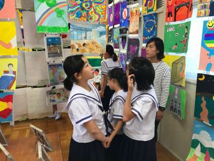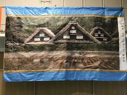 今年は3年生が「モザイクアート」に挑戦し、体育館の壁いっぱいの見事な大作を完成してくれました。修学旅行で訪れた白川郷の町並みを再現していました。