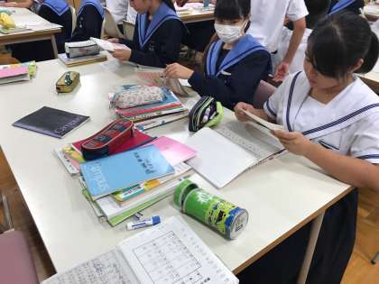 明後日、木曜日から2日間、2学期の中間テストがあります。すでにテスト範囲に達している教科は、テスト範囲の復習を自学自習の形式で行っています。1年の国語では、図書室を使って、プリントや小テストの返却、ノート整理を含めた復習をしていました。1年生も、もう中学校での定期テストに慣れたと思うので、しっかり復習し、自己の成績を伸ばしていってくださいね!